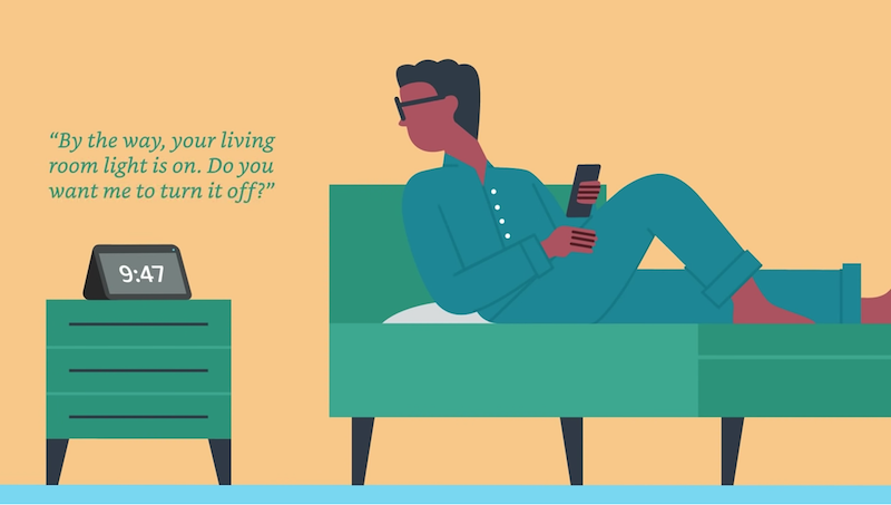 또 하나 주목할 만한 기능은 Smart Home Suggestions, 즉 스마트홈 제안 기능입니다. 이 기능은 기존에 소개되었던 Alexa Hunches, 즉 알렉사 예감 기능을 확대시킨 건데요, 상식적으로 이상한 일이 있을 때 제안을 해주게 됩니다. 아래 이미지를 보면, 밤에 침실에 있는데 거실 조명이 켜져 있는 것입니다. 거실에 아무도 없는데 말입니다. 이런 경우 거실 조명이 켜져 있는데 끌까요?라고 물어보는 것입니다.